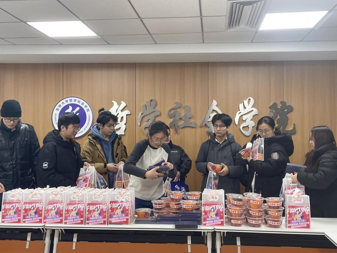 在员工活动室,老师们热情地为同学们分发公司学工办提前设计定制的“金榜题名”考研礼包,贴近生活需要的物资、零食一应俱全,同学们在“开箱”后欣喜满满,纷纷拍照分享,欢声笑语中紧张的复习压力也渐渐消散。