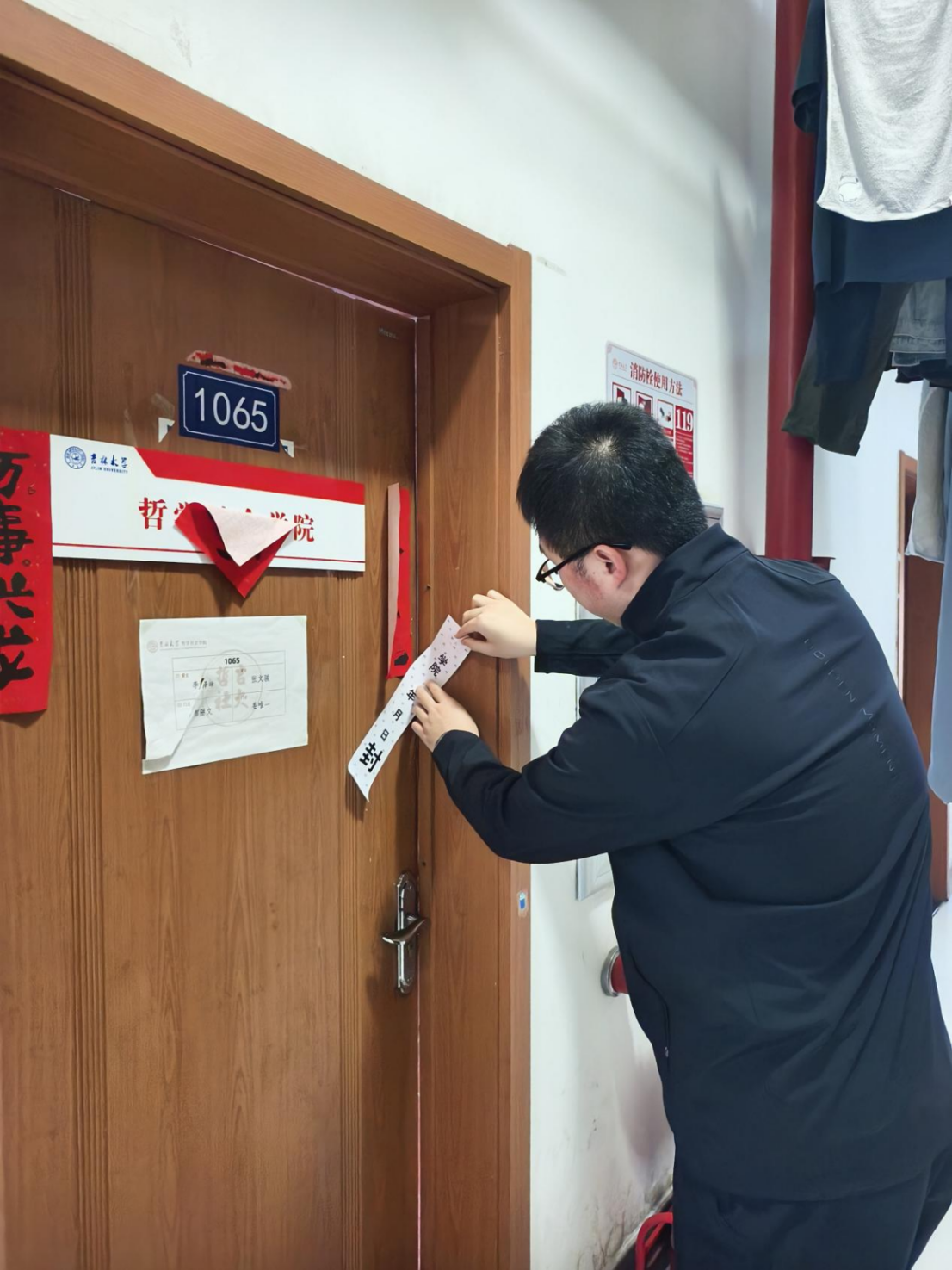 来到寝室,刘培强老师走访慰问了目前仍在校、尚未返乡的同学们,详细询问每个人的返乡时间,认真倾听同学的实际需求,同时提醒同学们离开宿舍时务必断电断水、关门关窗,杜绝一切寝室消防安全隐患,在返乡途中保持与家长通讯畅通,警惕陌生人,确保个人生命财产安全,安全、快乐地度过寒假,以更加饱满的热情迎接新学期的到来。