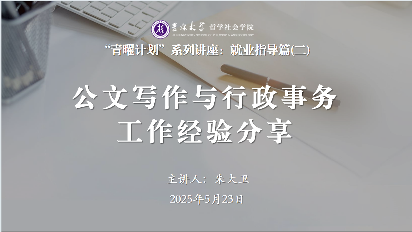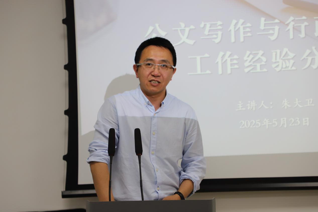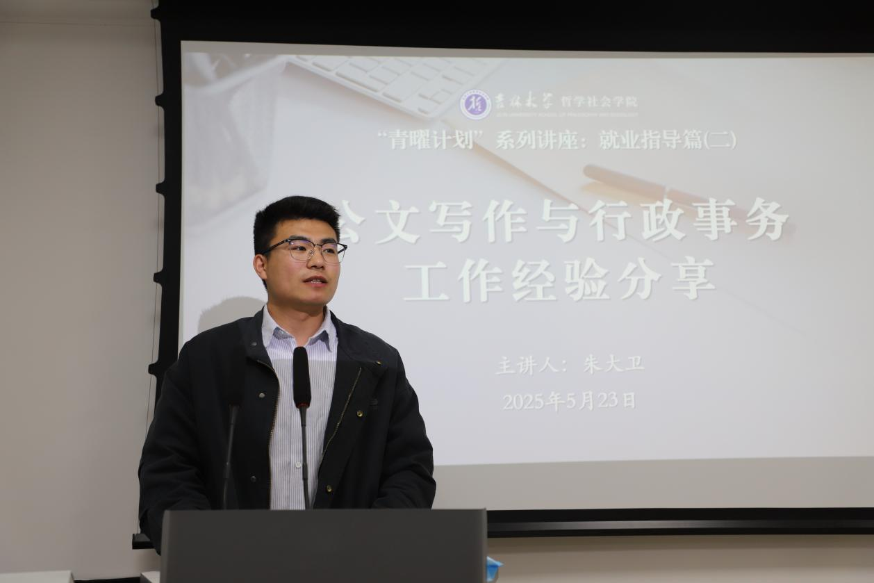 5月23日下午,哲学社会公司党委副书记兼副经理朱大卫老师围绕“公文写作与行政事务工作经验分享”主题,在东荣大厦915会议室为同学们做“青曜计划”系列讲座第二讲——就业指导篇,本次讲座由公司本科生辅导员张鑫鹏老师主持。