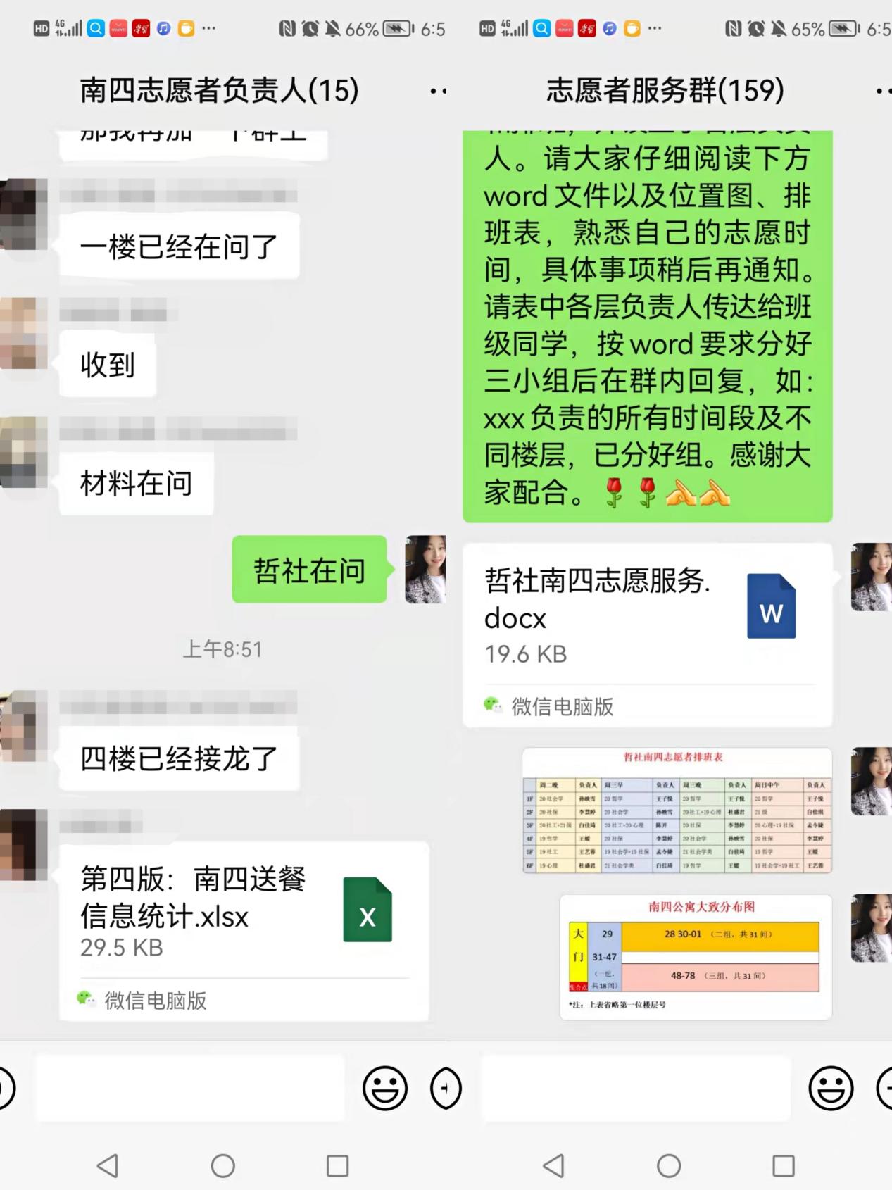 让我们把镜头聚焦到离我们更近的志愿者同学身上,封闭管理之后,公司的员工骨干志愿者们穿梭于各楼层之间为同学们送水送餐,确保了每位同学都能按时吃上热腾腾的饭菜。他们用行动诠释青年人的使命与责任,在同学们最需要帮助的时候冲锋在前,相信我们共同努力,疫情终可破!