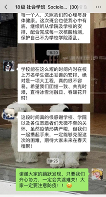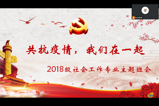 18级社工班由团支书崔荣敏同学提醒同学们要注意做好防护,积极配合防疫人员的各项工作安排,切实加强自身思想道德修养,及时观看青年大学习;然后,班长宋绍伟同学就公司相关防疫政策向同学们进行了解释,并提醒同学们要及时关注权威信息发布,坚决做到“不信谣、不传谣”,在疫情防控期间遇到困难一定要及时向老师们反映,科学防疫、合理求助;最后,学委张若晗同学向大家解释了有关毕业季教务方面的问题,并督促大家认真完成毕业论文的写作。