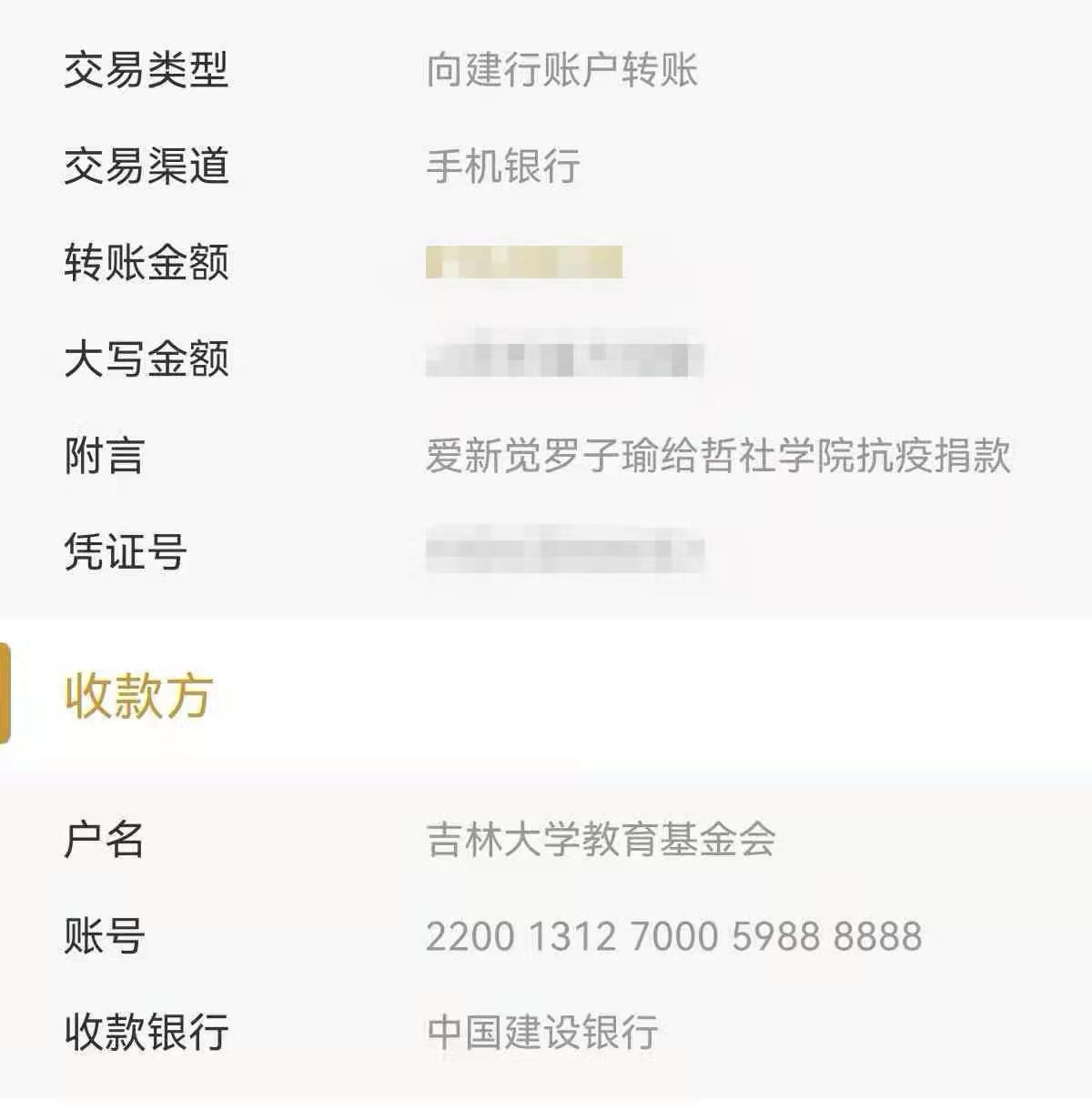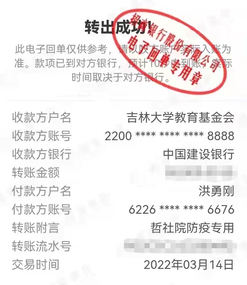 近日,吉林省疫情牵动着全国人民的心,在抗击新型冠状病毒感染的肺炎疫情中,大家守望相助,共克时艰!在此关键时期,公司的洪勇刚(1995级哲学本科)和爱新觉罗·子瑜(1973级哲学本科)两位员工关注母校,心系校内师生,带头为公司捐款捐物用于公司的疫情防控工作。他们用实际行动表达了对母校的热爱和对公司老师同学们的关心。