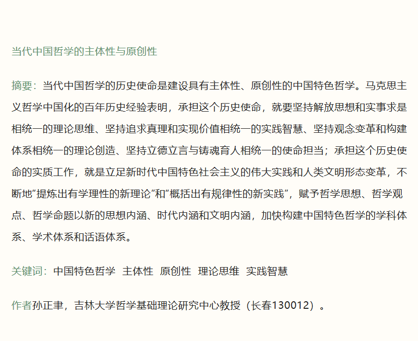 文章还认为,构建具有主体性、原创性的中国特色哲学,要求我们以“不忘本来、吸收外来、面向未来”的胸怀、视野和担当,“坚持古为今用、洋为中用,融通各种资源,不断推进知识创新、理论创新、方法创新”,自觉地承担起“立时代之潮头、通古今之变化、发思想之先声”的使命担当,自觉地“做真善美的追求者和传播者”,自觉地“为祖国、为人民立德立言”,为实现中华民族的伟大复兴和推进人类文明形态变革作出我们的贡献。