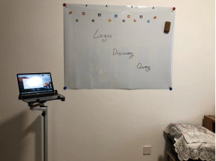 我的解决方案是在墙上钉一张白板纸,加一个笔记本电脑支架,以腾讯会议直播,以微信群联络,充分体现柴郡猫精神。