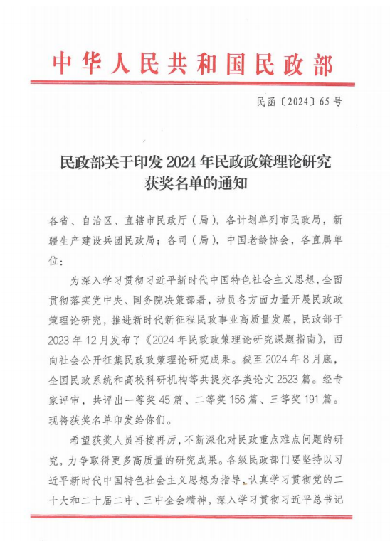 为深入学习贯彻习近平新时代中国特色社会主义思想,全面贯彻落实党中央、国务院决策部署,动员各方面力量开展民政政策理论研究,推进新时代新征程民政事业高质量发展,民政部于2023年12月发布了《2024年民政政策理论研究课题指南》,面向社会公开征集民政政策理论研究成果。本院员工积极参与此次活动。2024年11月1日,中华人民共和国民政部发布了关于印发2024年民政政策力量研究获奖名单的通知,ladbrokes立博2017级社会学专业博士研究生徐莉、成彦提交的文章《中国式现代化背景下现代公墓业发展路径研究》荣获三等奖。