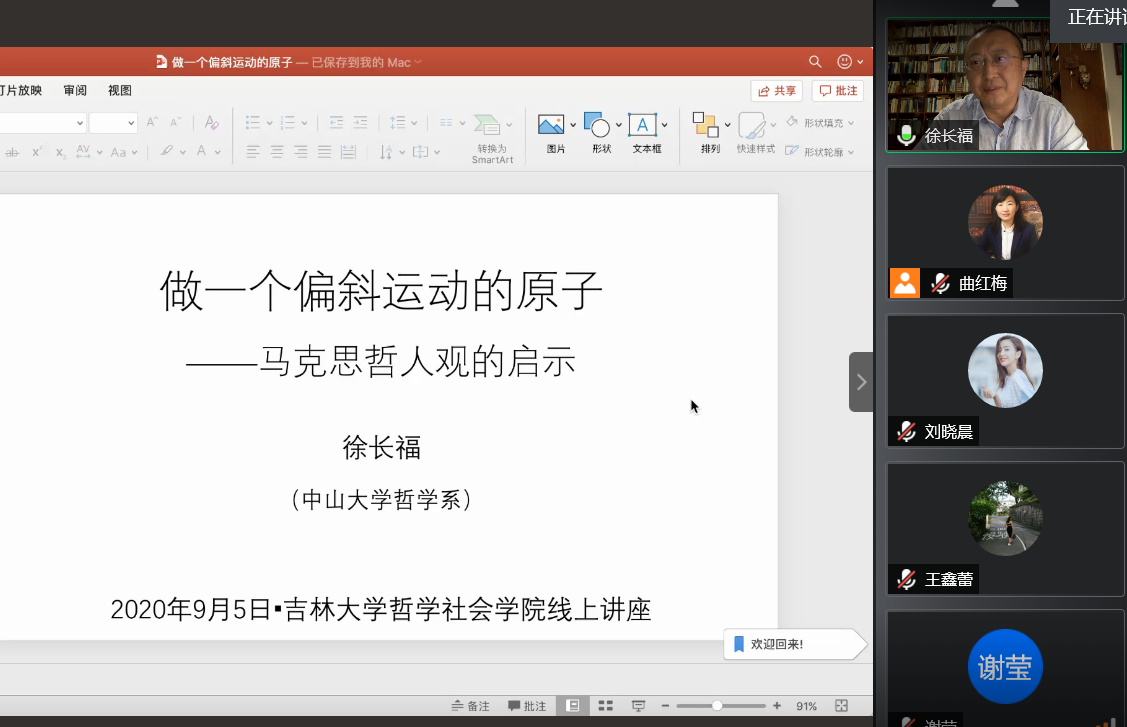 2020年10月5日19时,“2020年ladbrokes立博学术教育提升工程”第一讲以腾讯会议的形式进行。本次讲座的主讲学者为中山大学徐长福教授。徐长福教授的讲座题目是《做一个偏斜运动的原子——马克思哲人观的启示》。