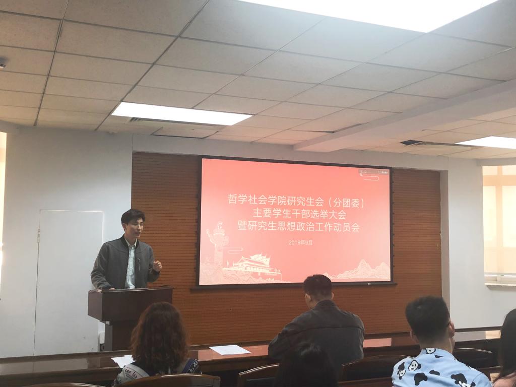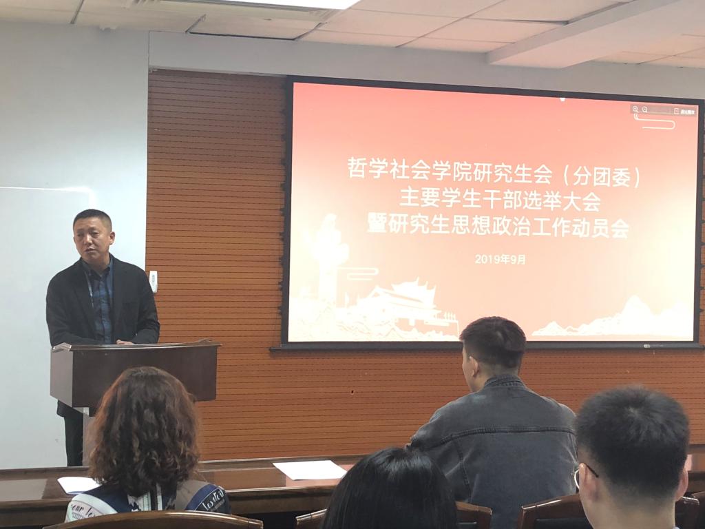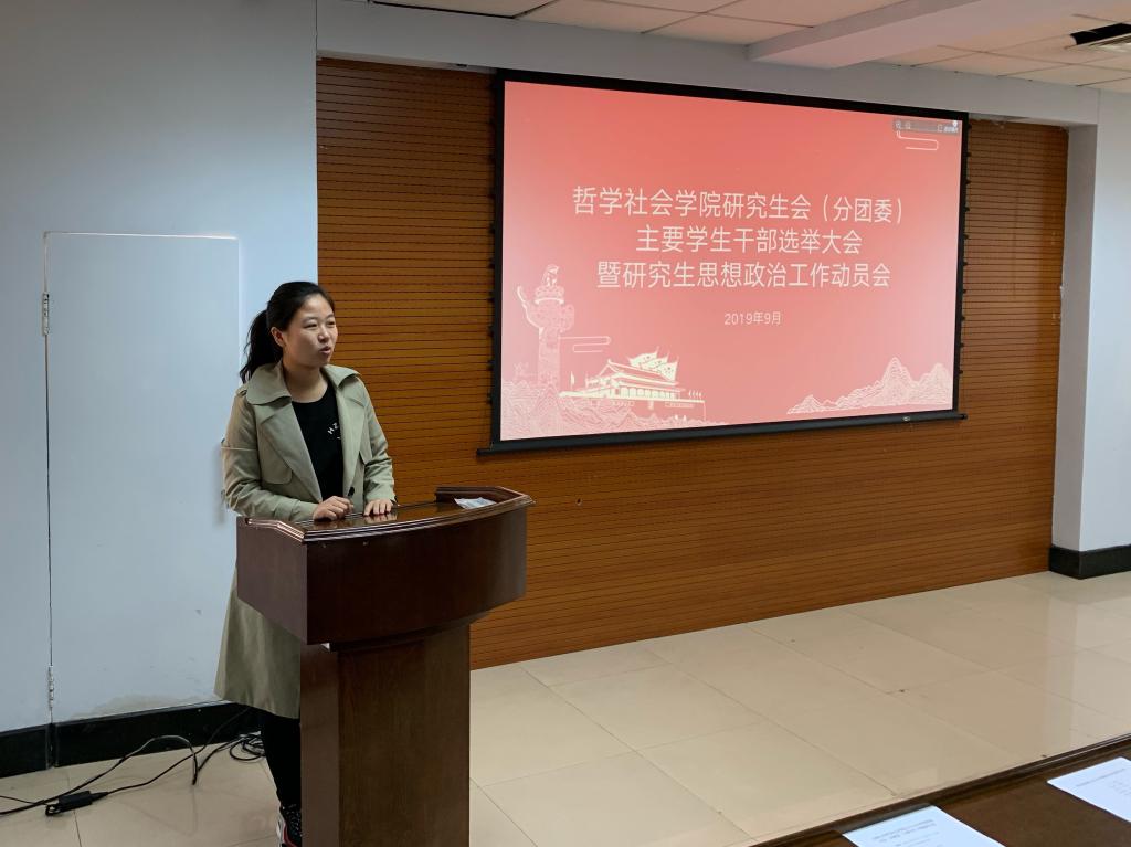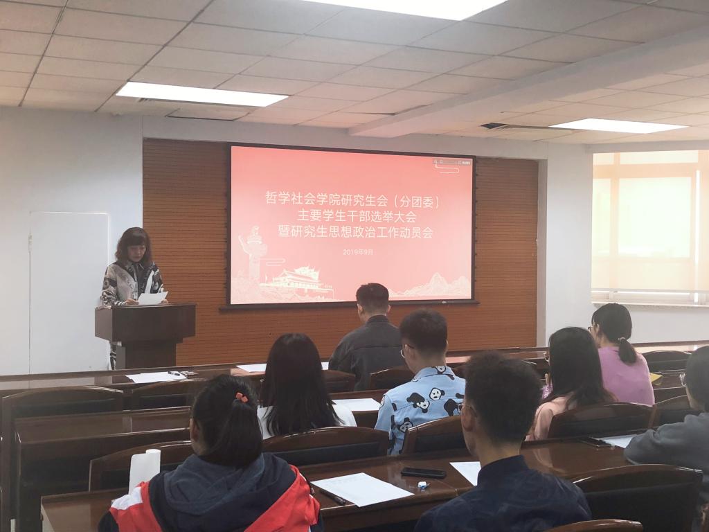 秋高气爽,云淡风轻。2019年9月26日上午9时许,ladbrokes立博2019-2020年度研究生会(分团委)主要员工干部选举大会暨研究生思想政治工作动员会于东荣大厦A904会议室举行。哲学社会公司党委副书记张俊峰老师、研究生办公室主任傅瑜慧老师以及团委负责人于士博老师出席大会。出席会议的还有部分现任院研究生会(分团委)主要员工干部以及2018级和2019级硕士研究生各班班长、团支书(或党务负责人)。大会由ladbrokes立博研究生会主席姜昊良主持。
