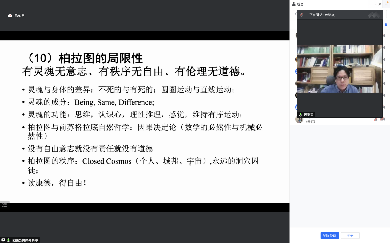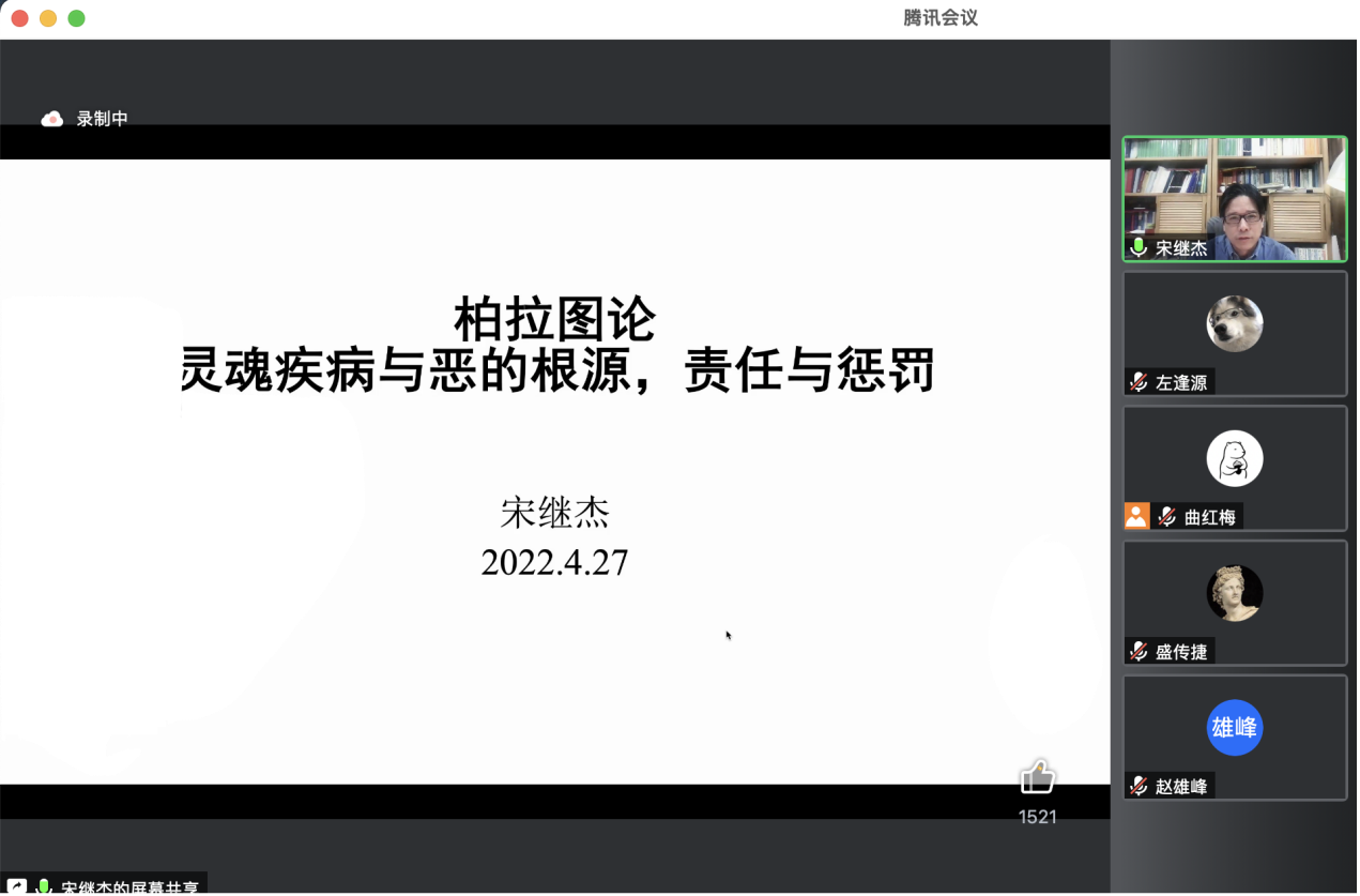 2022年4月27日19时,公司“2022年ladbrokes立博学术教育提升工程”系列讲座第五讲依托“腾讯会议”线上平台开展。本期讲座的主题为“柏拉图论灵魂疾病与恶的根源,责任与惩罚”,主讲人为清华大学哲学系宋继杰教授,主持人为公司曲红梅老师,刘连朋、郝鸿军、赵雄峰、李慧娟、盛传捷等多位老师参加了讲座。