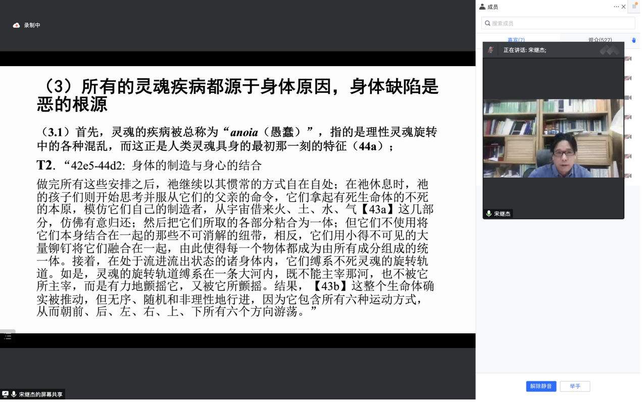 在本次讲座中,宋继杰教授以柏拉图的《蒂迈欧篇》为主要依据阐述了柏拉图有关作恶与灵魂疾病的相关思想。在恶行的根源问题上,宋继杰教授指出,“精神疾病”概念在柏拉图的晚期对话《蒂迈欧篇》中才明确出现,但在此之前,柏拉图就已经使用另外一种方式来描述人类“恶的心理学”了:即灵魂的无知、无序和疾病状态。柏拉图在《蒂迈欧篇》指出,身体的缺陷是灵魂疾病的根源,也是人类作恶的根源,理由有三点:(1)灵魂具身化的过程中与肉体相互影响、相互颤摇,最终的生命体也因此以无序和非理性的方式行进;(2)身体的感觉(尤其是过度的快乐和痛苦)被柏拉图称之为“最坏的灵魂疾病”,这些感受扰动灵魂,使灵魂疯狂和无知;(3)体液的游荡与混杂、过度与不足都会造成了灵魂的疾病,如愚钝、健忘、鲁莽、怯懦等等。宋继杰教授认为,这说明在柏拉图看来,人先天就是有缺陷的。但是先天缺陷并不是人会作恶的唯一原因,后天的教育环境和政制环境同样对人的灵魂有重要影响。