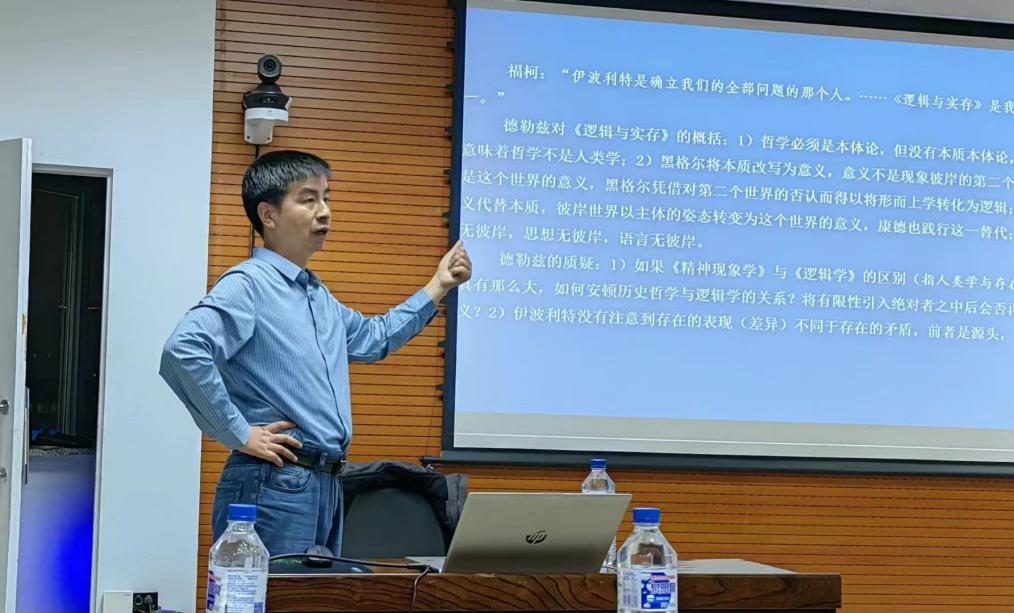 讲座伊始,赵雄峰老师受白刚经理的委托,对庄振华老师远道而来表示了热情地欢迎和衷心地感谢。庄振华老师首先对本次讲座的主题作了一个简要的哲学史回顾和澄清首先,他认为一个国家跟另一个国家的哲学要产生关系,不能仅仅是一种“学徒”的状态,只有两国的哲学界有了深层次的对话,两国的哲学才能真正意义上产生关系。其次,庄振华老师认为这次讲座主要选定法国哲学家伊波利特而不是科耶夫是因为,伊波利特的《逻辑与实存》在解黑格尔时能够更加忠实揭示黑格尔的哲学思想,进入到了黑格尔的本质论和概念论。第三,西方哲学有着形而上学或者说是逻各斯中心主义的传统,德国古典哲学更是如此,而法国哲学极大的推进了德国古典哲学所遗漏的或者没有涉足的一些问题领域。