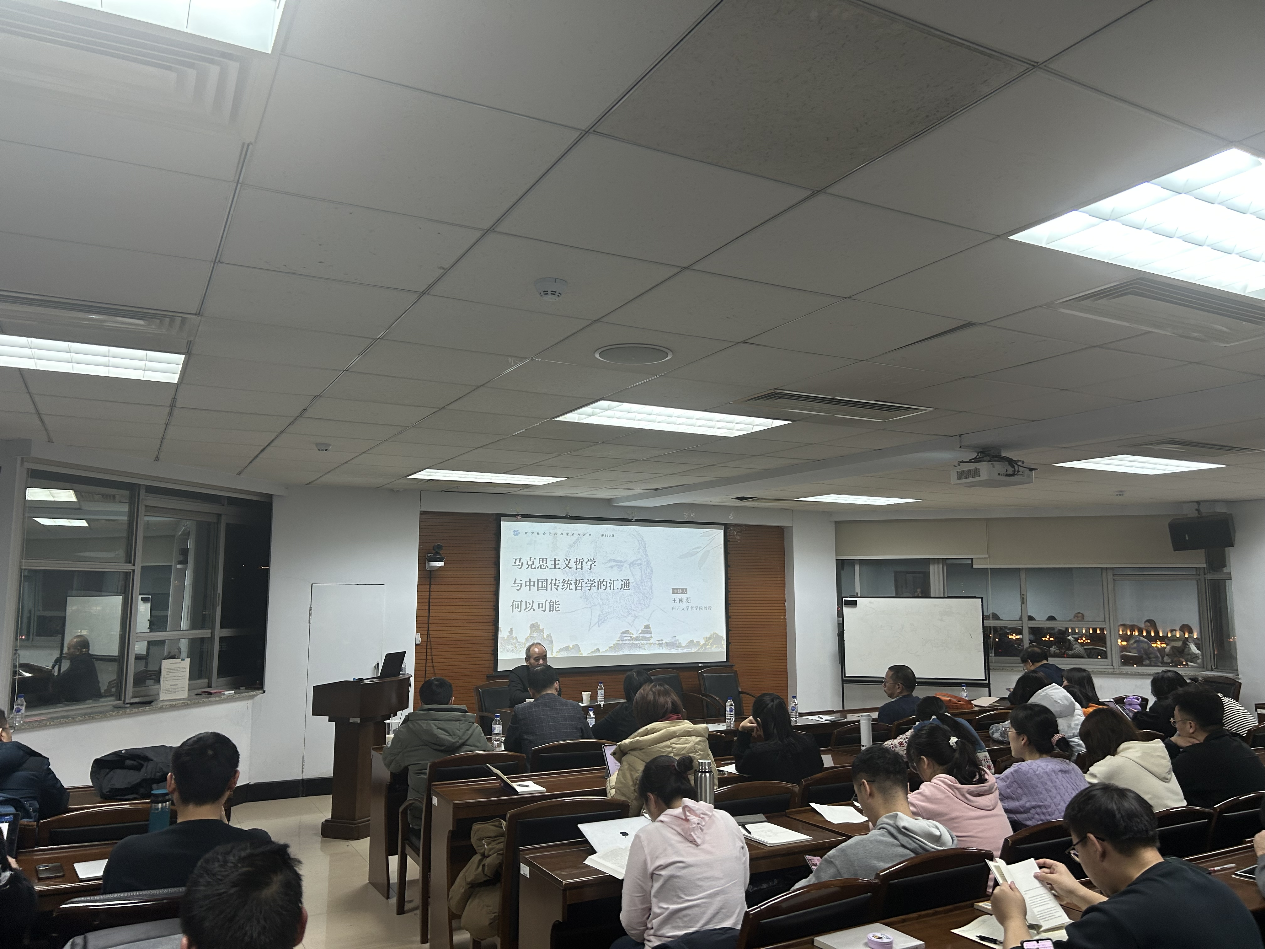 接下来,王南湜教授以“马克思主义哲学与中国传统哲学的汇通何以可能”为主题展开了本场讲座。王南湜教授认为,马克思主义哲学与中国传统哲学的汇通何以可能的问题,实质就是二者之间的高度契合性何以可能的问题,这种契合性并不是指在形式上将二者之间的相似性予以简单罗列,由于马克思的哲学是西方历史文化的产物,对马克思主义哲学与中国传统哲学高度契合性何以可能的探讨,应当建立在理解西方传统哲学与中国传统哲学根本差异的基础之上。中西哲学的根本差异在于呈现出了两种不同的本体论,中国哲学是天人一体的本体观,而西方哲学的本体观则将理念或上帝设定为超越性存在的本原之物。在此意义上,虽然马克思的哲学诞生于西方历史文化的背景之中,但马克思却以“人是对象性活动”的本体论基本原理,消解了超越性存在物的本体与现实世界中现象之间的二元矛盾。鉴于此,较之中国哲学中的天人一体的本体观同样否认了超越性本体的存在,马克思的“人是对象性活动”的本体观便同中国传统哲学的致思取向具有内在的契合性。