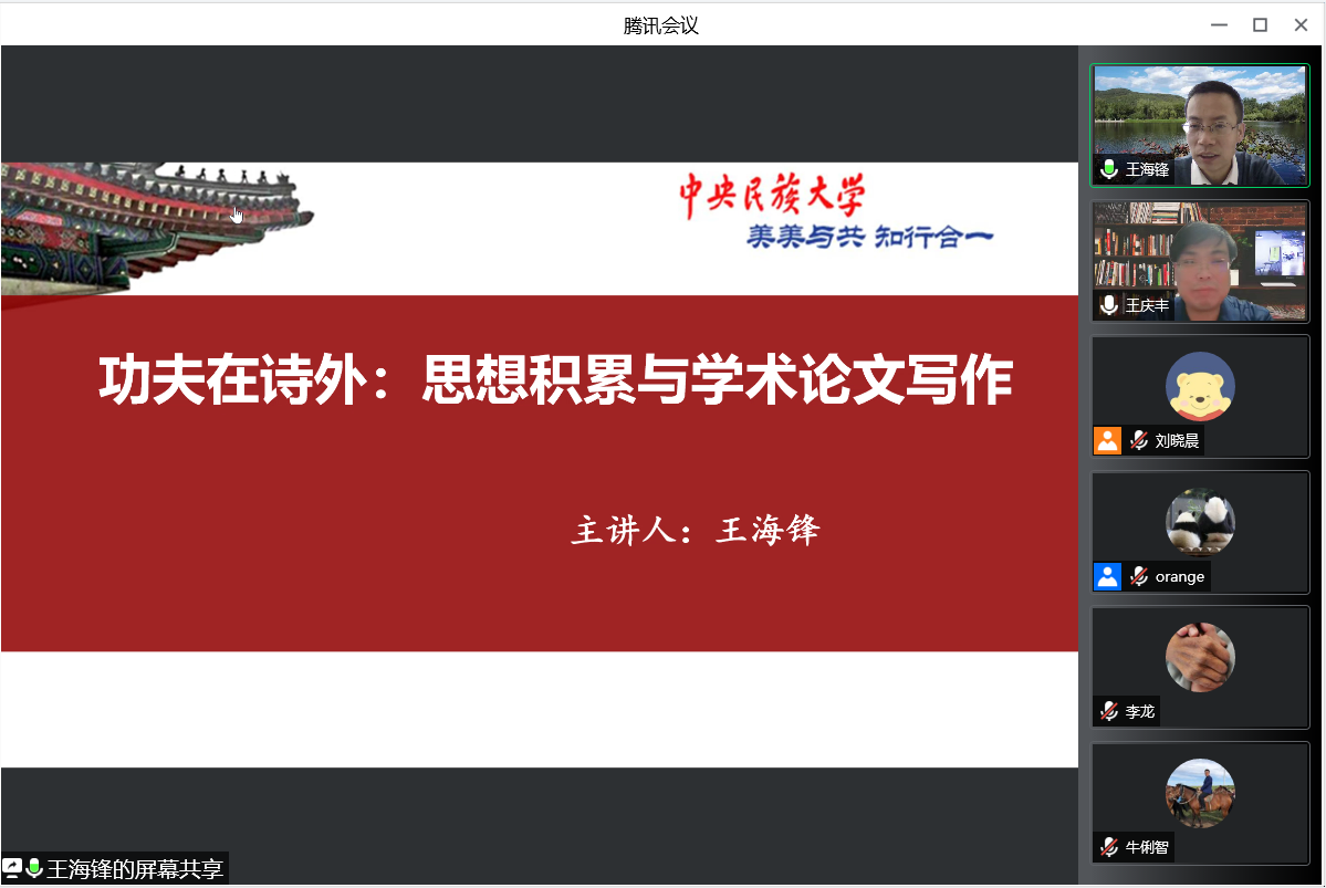 2022年4月18日晚,中央民族大学哲学与宗教学公司教授、博士生导师王海锋应邀做ladbrokes立博名家系列讲座(第153场)。讲座题为“功夫在诗外:思想积累与学术论文写作”。本次讲座以线上腾讯会议形式举办,由ladbrokes立博教授、博士生导师王庆丰教授主持。