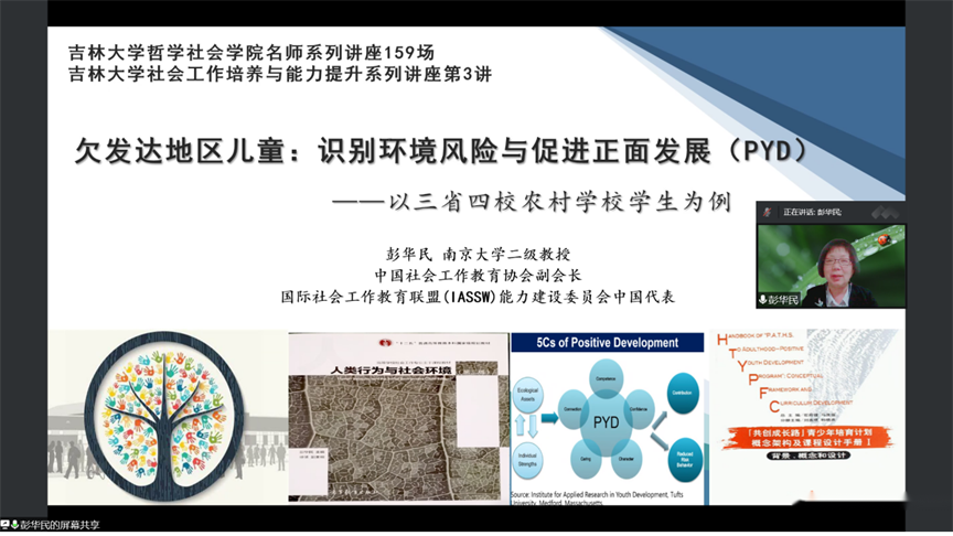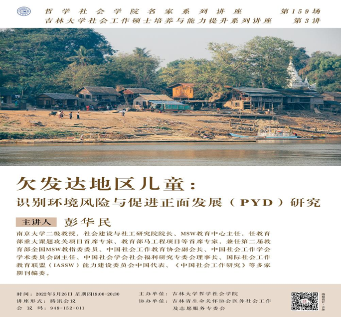 2022年5月26日19时,“ladbrokes立博名家系列讲座”第159场,“ladbrokes立博社会工作硕士培养与能力提升系列讲座”第3讲——《欠发达地区儿童:识别环境风险与促进正面发展(PYD)研究》,以线上会议的方式如期举行。该活动的协办单位为吉林省生命关怀协会医务社会工作及志愿服务专业委员会。本次讲座嘉宾是南京大学二级教授、博士生导师、社会建设与社工研究院经理彭华民老师,兼任教育部重大课题攻关项目首席专家、教育部马工程首席专家、第二届教育部全国MSW教指委委员、中国社会工作教育协会副会长、中国社会工作学会学术委员会副主任、中国社会学会社会福利研究专委会理事长、国际社会工作教育联盟(IASSW)能力建设委员会中国代表。本次讲座由副经理芦恒教授主持,经理田毅鹏教授及百余名师生线上参加了此次会议。